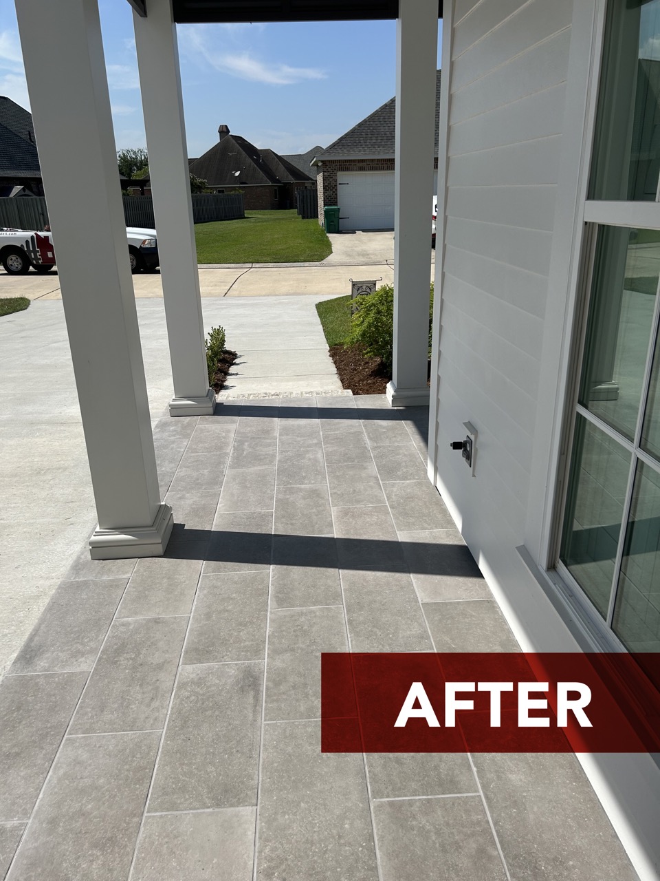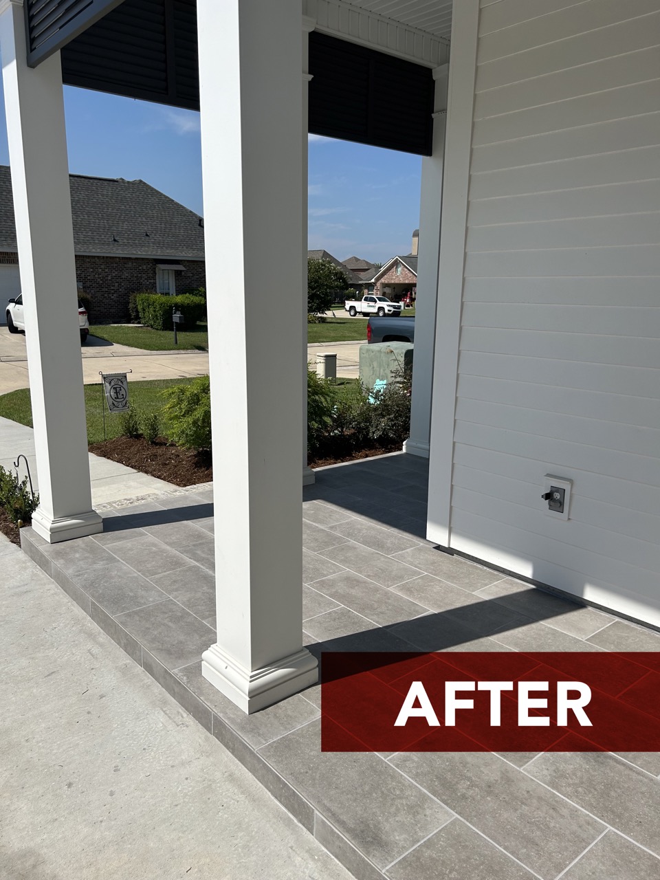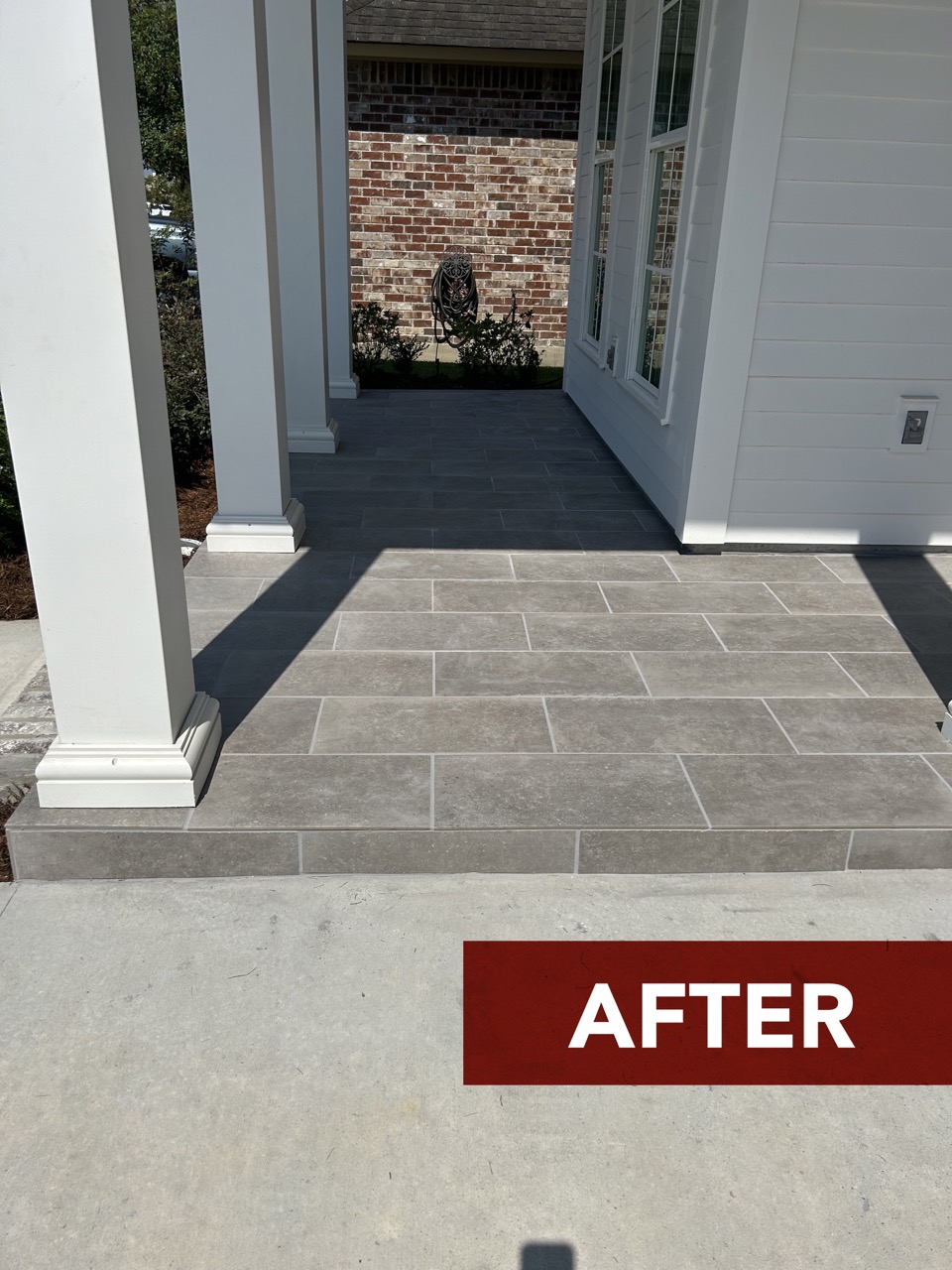 Take a peek at this front porch glow up! We installed a 12″x24″ stone overlay to take the concrete from basic to beautiful! Browse below to see the before/after photos and build with Dell!