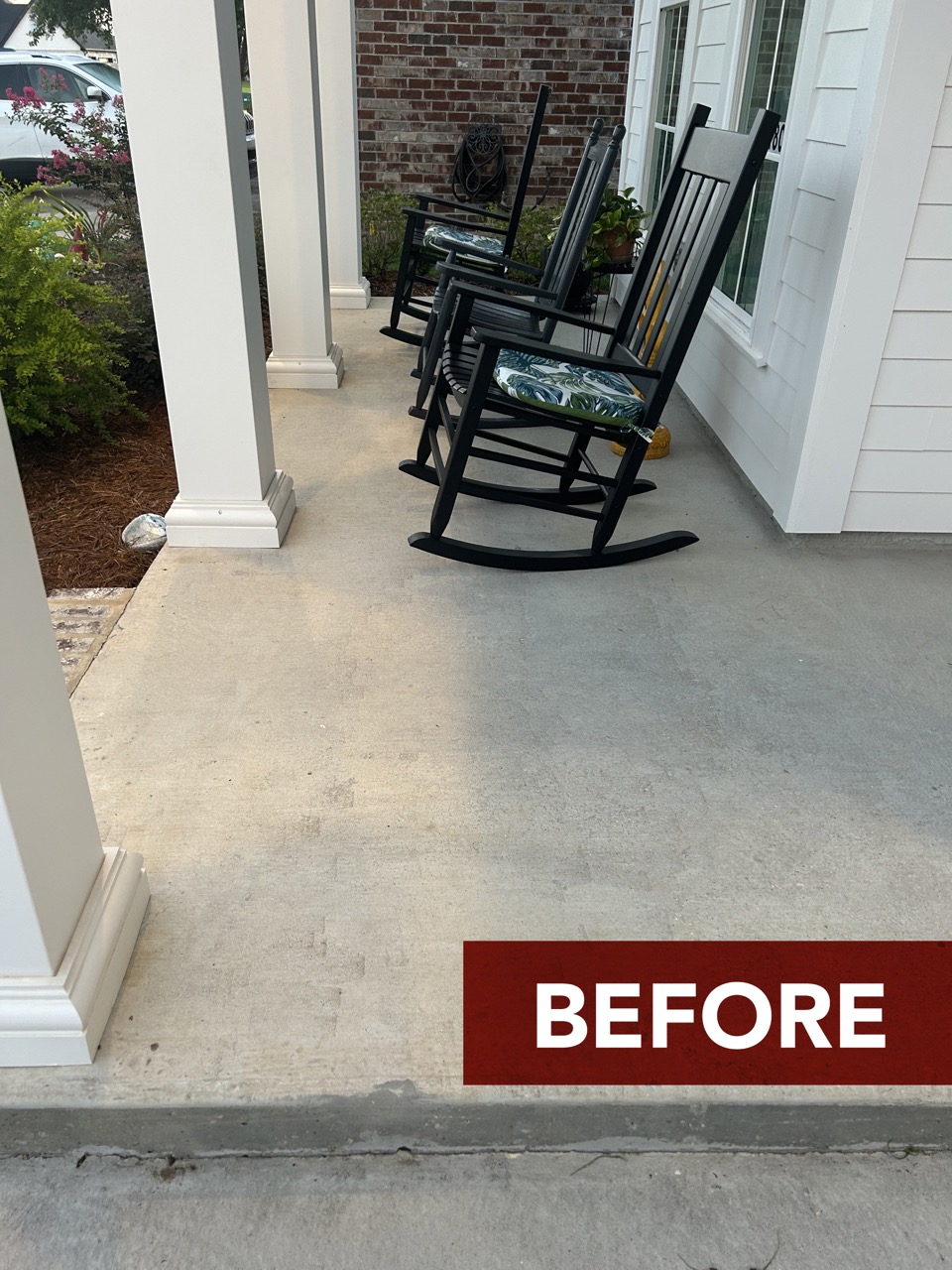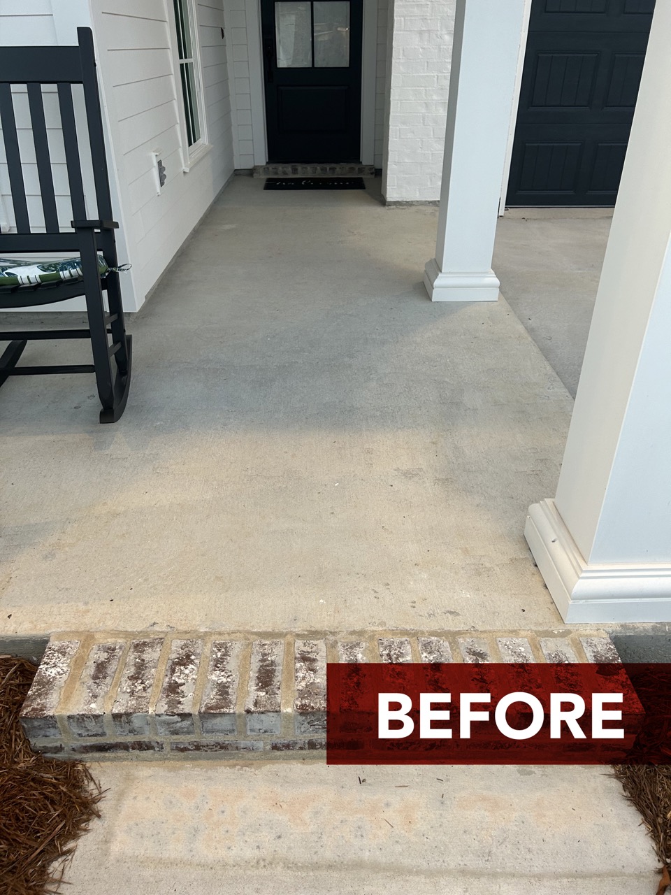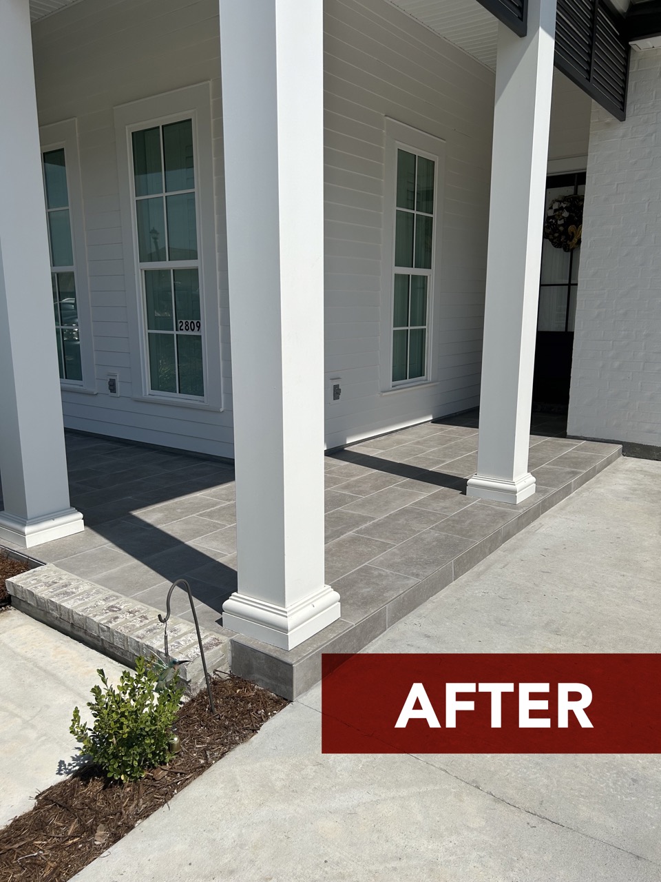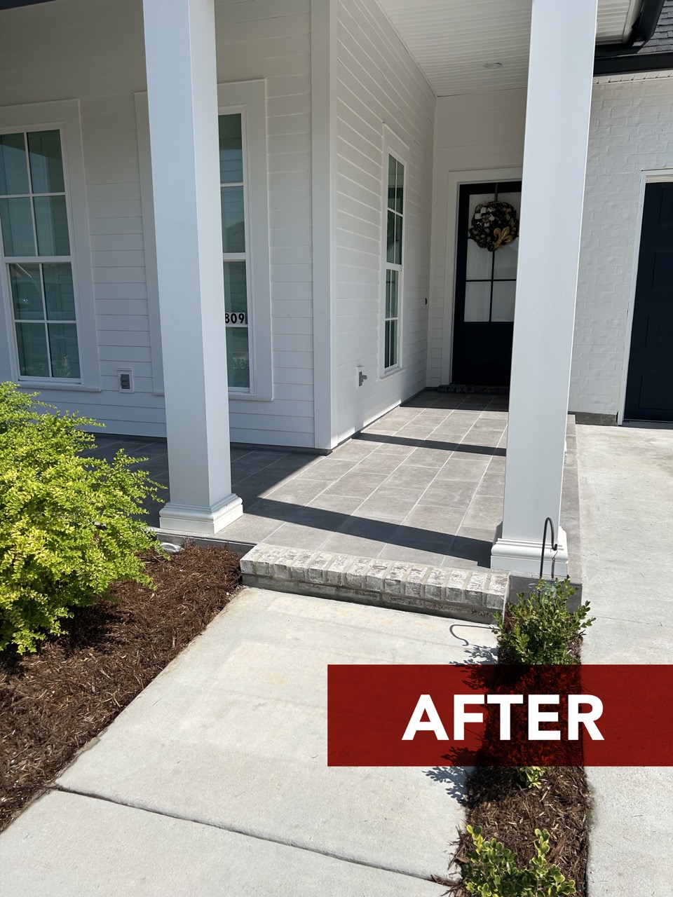 Take a peek at this front porch glow up! We installed a 12″x24″ stone overlay to take the concrete from basic to beautiful! Browse below to see the before/after photos and build with Dell!